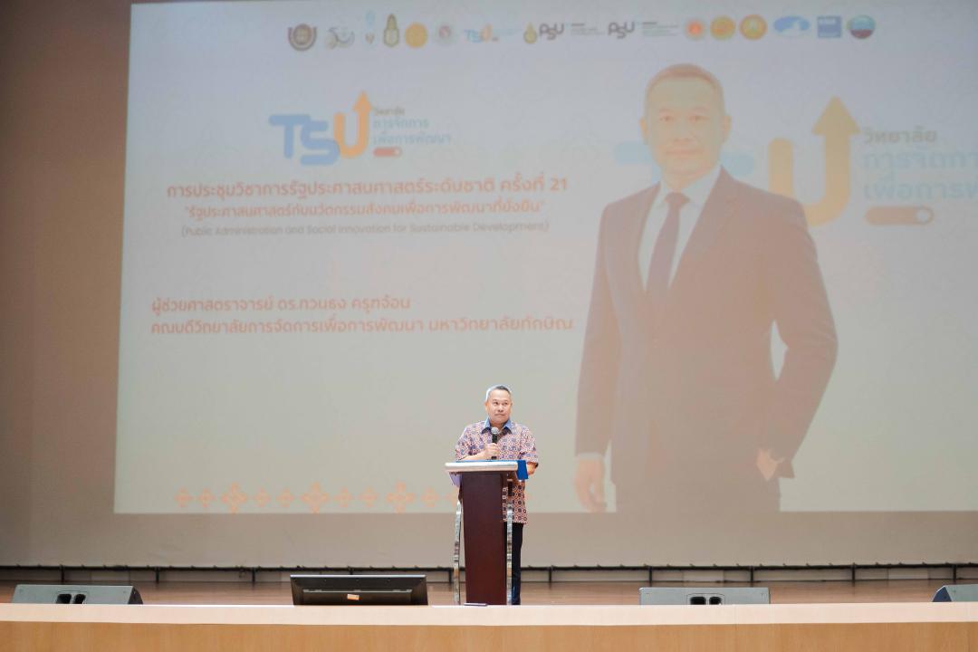 สมาคมรัฐประศาสนศาสตร์แห่งประเทศไทย ร่วมกับ วิทยาลัยการจัดการเพื่อการพัฒนา มหาวิทยาลัยทักษิณ และเครือข่ายสถาบันอุดมศึกษาด้านรัฐประศาสนศาสตร์และรัฐศาสตร์ ร่วมเป็นภาคีเครือข่ายองค์การร่วมในการประชุมวิชาการรัฐประศาสนศาสตร์ระดับชาติ ครั้งที่ 21 “รัฐประศาสนศาสตร์กับนวัตรกรรมสังคมเพื่อการพัฒนาที่ยั่งยืน” (Public Administration and Social Innovation for Sustainable Development) ในวันที่ 26 กันยายน 2568 ณ หอเปรมดนตรี มหาวิทยาลัยทักษิณ วิทยาเขตสงขลา โดยมี รองศาสตราจารย์ ดร.ณฐพงศ์ จิตรนิรัตน์ อธิการบดีมหาวิทยาลัยทักษิณ ประธานเปิดงาน  พร้อมด้วยผู้ช่วยศาสตราจารย์ ดร.ทวนธง ครุฑจ้อน คณบดีวิทยาลัยการจัดการเพื่อการพัฒนา มหาวิทยาลัยทักษิณ ร่วมให้การต้อนรับศาสตราจารย์ ดร.อัมพร ธำรงลักษณ์ นายกสมาคมรัฐประศาสนศาสตร์แห่งประเทศไทย