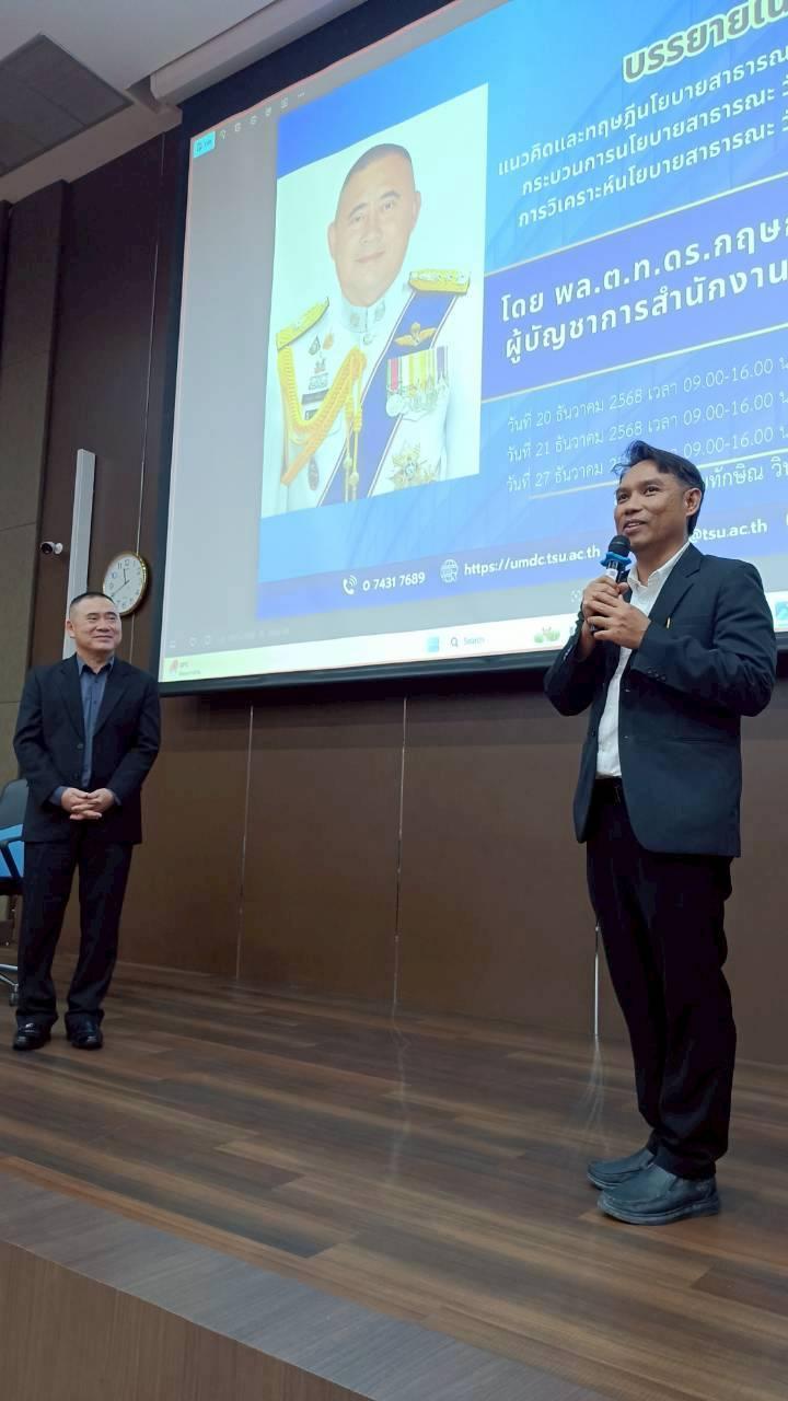 วิทยาลัยการจัดการเพื่อการพัฒนา ขอขอบคุณ  พล.ต.ท.ดร.กฤษกร พลีธัญญวงศ์ ผู้บัญชาการสำนักงานตรวจสอบภายใน บรรยายพิเศษให้แก่นิสิตหลักสูตรรัฐประศาสนศาสตรบัณฑิต สาขาวิชาการบริหารงานตำรวจและกระบวนการยุติธรรม และ หลักสูตรรัฐประศาสนศาสตรมหาบัณฑิต สาขาวิชารัฐประศาสนศาสตร์ วิทยาลัยการจัดการเพื่อการพัฒนา มหาวิทยาลัยทักษิณ ในหัวข้อ "แนวคิดและทฤษฎีนโยบายสาธารณะ" วันที่ 20 ธันวาคม 2568 และ "กระบวนการนโยบายสาธารณะ" วันที่ 21 ธันวาคม 2568 เวลา 09.00-16.00 น. ณ ห้องประชุม 18302 ชั้น 3 อาคาร 50 มหาวิทยาลัยทักษิณ วิทยาเขตสงขลา