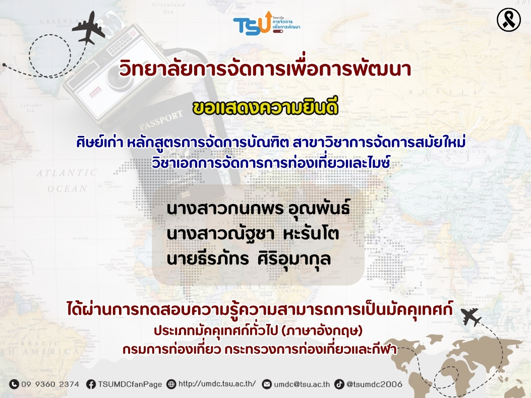 ขอแสดงความยินดี ศิษย์เก่า หลักสูตรการจัดการบัณฑิต ได้ผ่านการทดสอบความรู้ความสามารถการเป็นมัคคุเทศก์